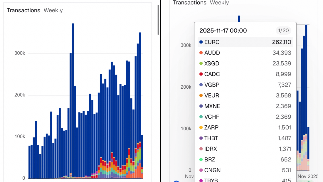 Local stablecoins on Base have climbed to over 300K weekly transactions, continuing a steady uptrend as Base’s Jesse Pollak publicly backs local rails again as part of the chain’s strategy.